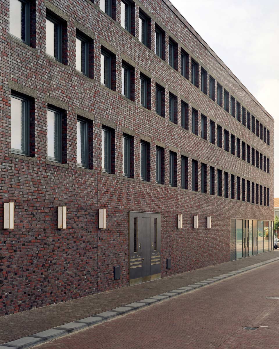 The restrained character of the building is enriched by the refined arrangement of the facades and the detailing of the masonry. The large glass surfaces at the front sides express the public character of the functions on the ground floor. A corner tower emphasizes the central location of the building.