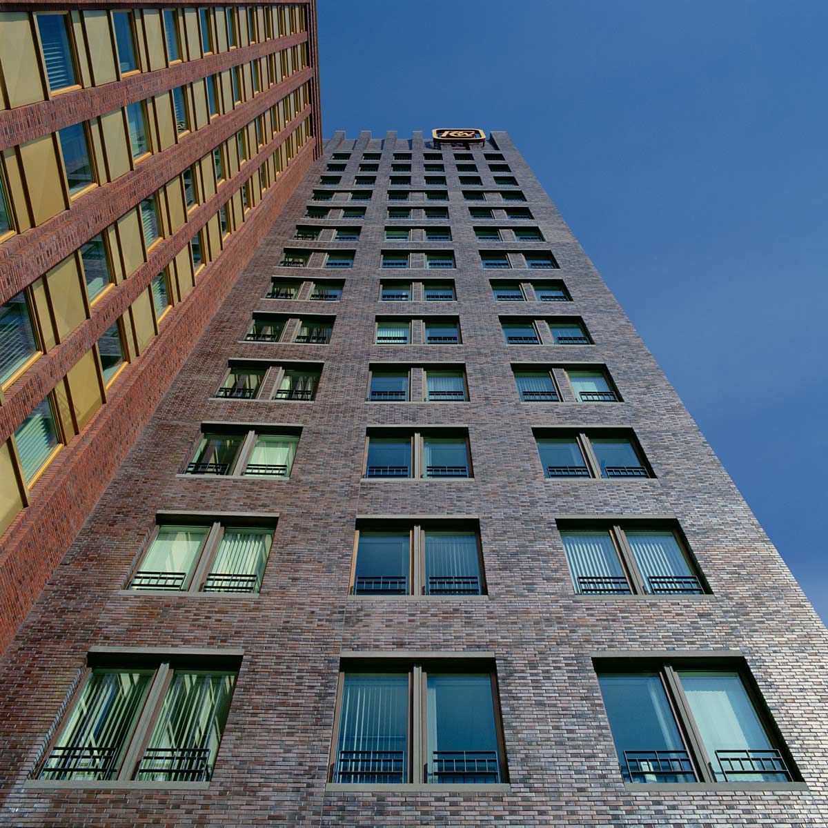 Alongside the A16 highway near the Van Brienenoord Bridge, three towers rise up from a green dike. This building complex was designed in collaboration with Hans Kollhoff as an ensemble of three building volumes, with a higher rising middle tower flanked by two side towers. Due to the different façade design of the two architects’ offices, the building appears as an ensemble of independent towers, whereby the different handwriting of the architects was deliberately emphasised without striving for stylistic contrasts. The tower designed by Rapp+Rapp is a combination of traditional masonry and prefabricated concrete elements at which the window proportions are gradually changing towards the top. The building complex is surrounded by a large forecourt, a terrace and monumental staircases.