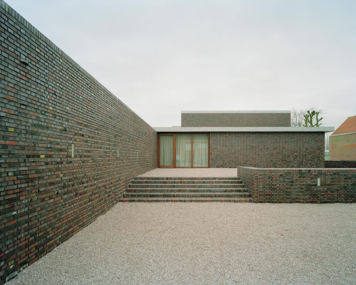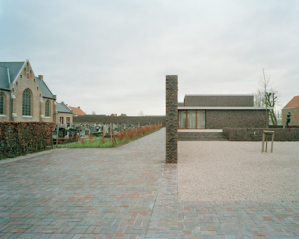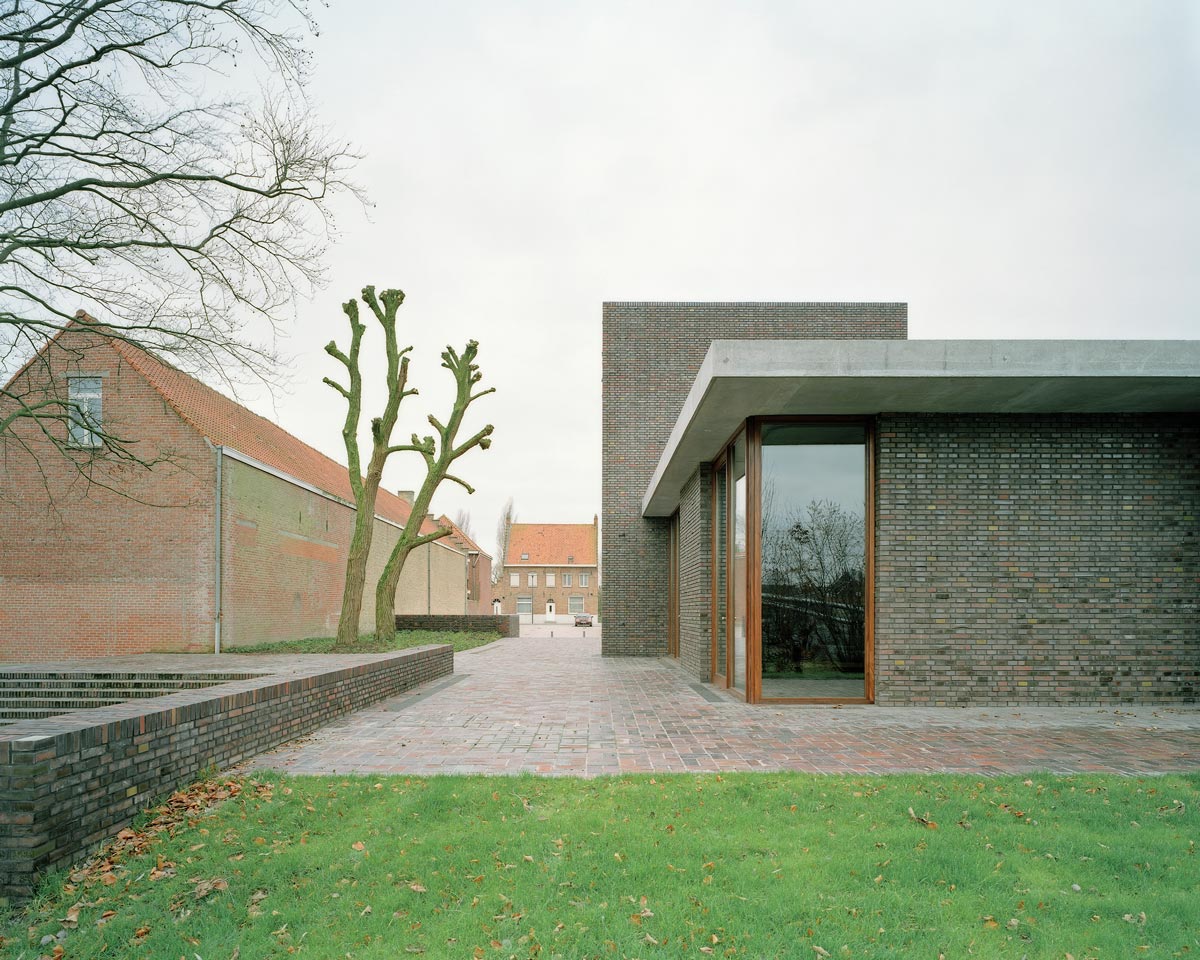 For the Houthulst municipality Rapp+Rapp built a small-scale community centre. The village is characterized by a ribbon building intersection, on the corners of which a church with churchyard and rectory, the local pub and a bank are located. The fourth corner was to be held vacant because of the morphological significance of the surrounding landscape. The L-shaped plot for the community centre was allocated next to the church and behind the rectory.