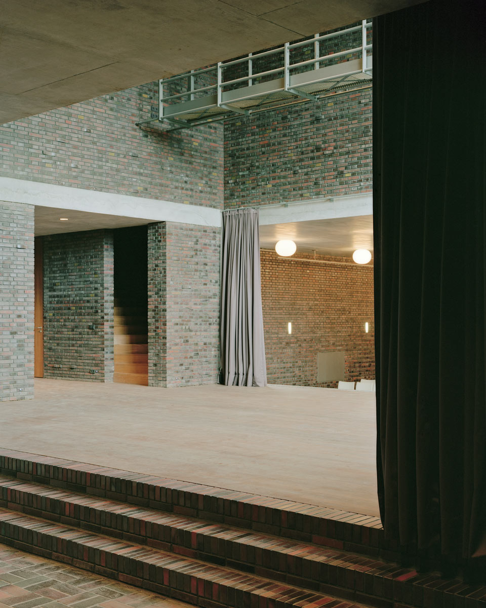 Die Organisation des Gebäudes erklärt sich größtenteils aus der Frage nach Flexibilität, der charakteristischen Verortung und dem Wunsch einer vielseitigen Zugänglichkeit. Die massiven Backsteinfassaden begleiten den Besucher bis zum Eingang im inneren Winkel des Gebäudes und schirmen gleichzeitig den angrenzenden Friedhof ab. Die Bühne ist mittig im Theatersaal angeordnet und kann je nach Bedarf von verschiedenen Seiten bespielt werden. Sie ermöglicht unterschiedliche Nutzungen, deren räumliche Konfiguration mit flexiblen Elementen angepasst werden kann. Die geschlossenen Wandscheiben wechseln sich ab mit vollkommener Transparenz, es entstehen fließende Räume die über Raumhohe Fenster im Kontakt zur Außenwelt stehen.