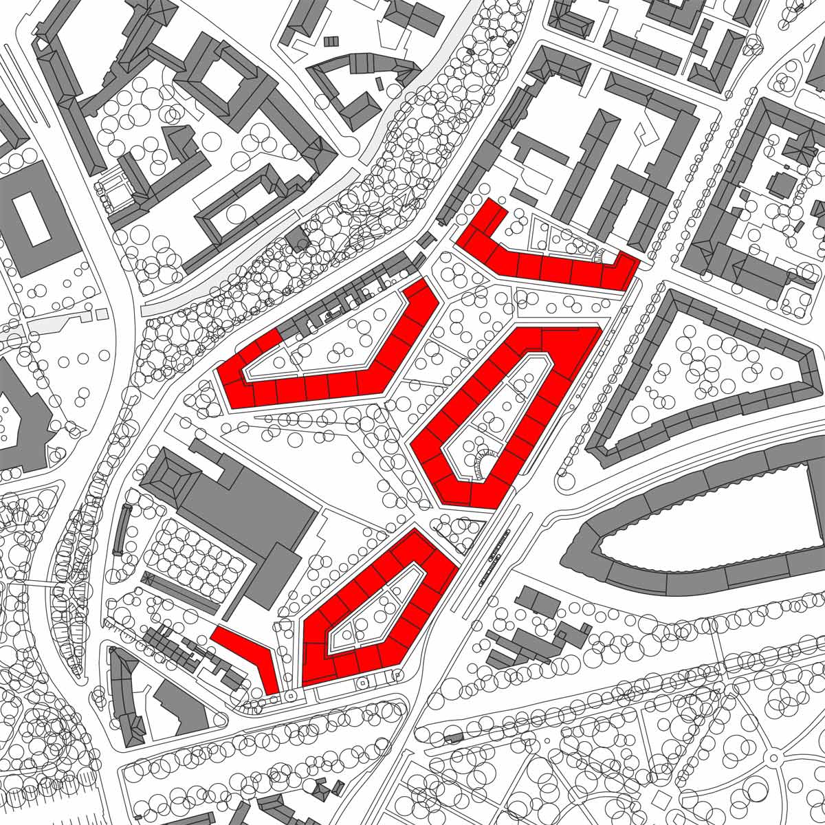 Die Planung bezieht sich auf die historischen Qualitäten der umgebenden Blockrandbebauung. Parzellierung wie Nutzung stärken infolgedessen die Identität des Ortes. Die polygonalen Blockformen verstehen sich als Interpretation und Weiterentwicklung der raumbildenden Baulinienplanungen Theodor Fischers. Vier Baublöcke flankieren den zentral im Plangebiet gelegenen Quartierspark. Durch die Positionierung der Blöcke entstehen unterschiedliche Räume wie Straßen-, Platz-, Park- und Hofraum.