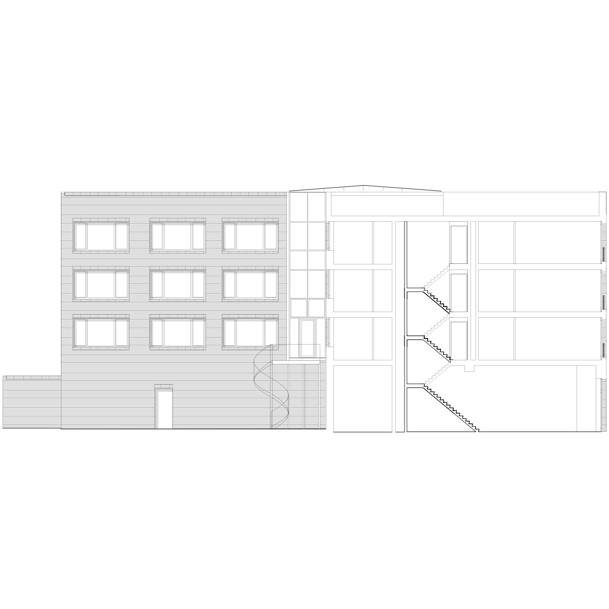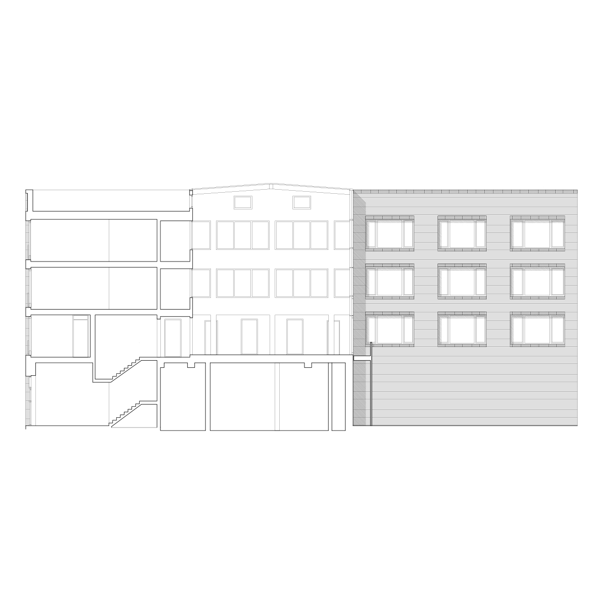 With its differentiated façade grid, the building fits into the delicate urban fabric and at the same time adopts the extensive spatial programme. The residential units are organised on both sides of the central corridors and face either the street or the garden. On the first floor, in the inner corner of the building, an atrium serves as a communal space for the residents. The brick facade and wooden windows fit in with the materialization of the traditional houses in the area.