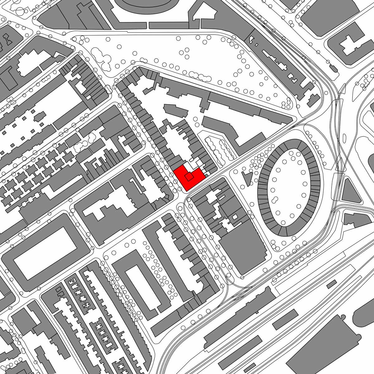 The student residence is located within walking distance of Hollands Spoor station, on the corner of Stationsweg and Oranjelaan. This inner-city location is characterised by its narrow parcellation with small-scale individual houses. The municipality of The Hague intended to transform this part of the city into a ‘Quartier Latin’, with a great diversity of residents: students, starters, high and low incomes.