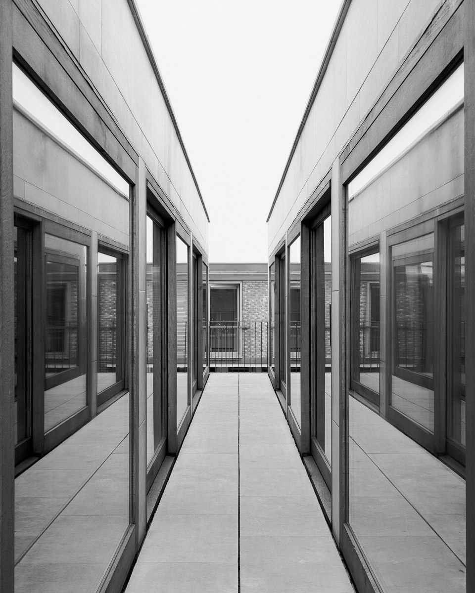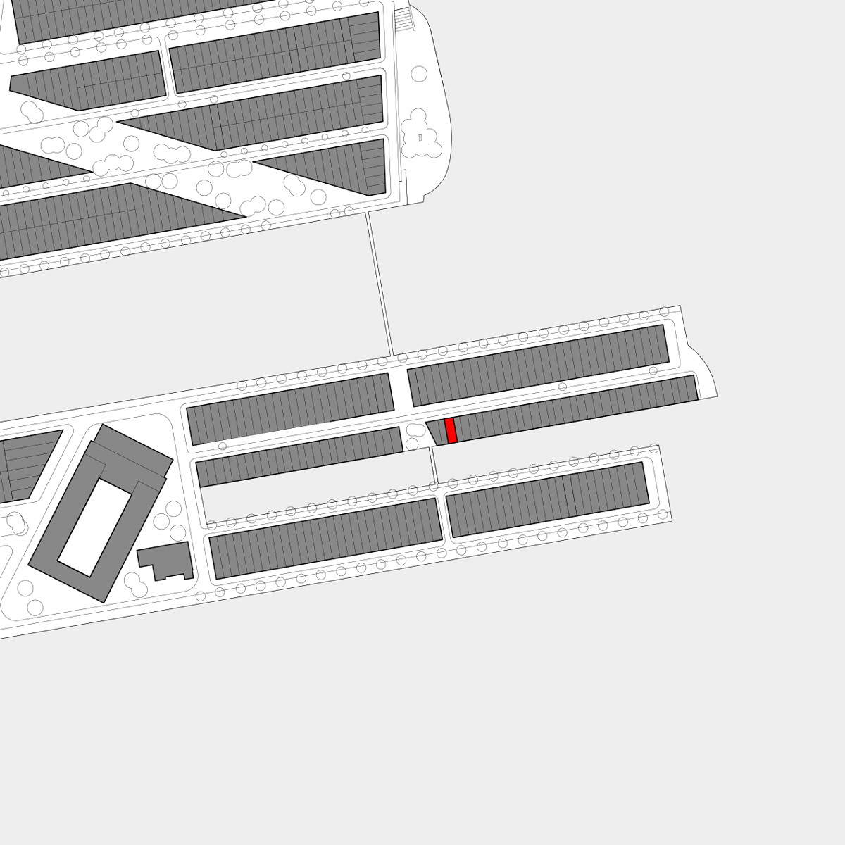 Ein besonderes Merkmal des Entwurfs ist die zweifache Längsteilung des Wohnhauses. Im Erdgeschoß entsteht dadurch ein Privatweg zum rückwärtig gelegenen Kanal, auf dessen halber Höhe sich der Eingang des Hauses befindet; im zweiten Obergeschoß zieht sich eine schmale Dachterrasse über die gesamte Tiefe des Grundstücks.
