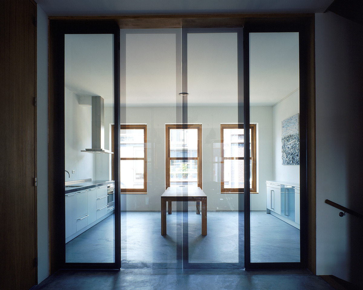 Dieser Eingriff führt zu einer unkonventionellen Dreiteilung des Hauses, sowohl im Grundriss als auch im Schnitt. Er beruft sich in der Zeichenhaftigkeit des Buchstabens H auf eine Welt außerhalb der Architektur, kreiert aber zugleich die eindeutige Repräsentativität der Fassade. Das herrschaftliche Erscheinungsbild zur Straße wird an der Rückseite des Hauses wiederholt. Das verwendete Material, wie etwa belgischer Blaustein, verweist nach vertrauten Elementen des Amsterdamer Grachtenhauses.