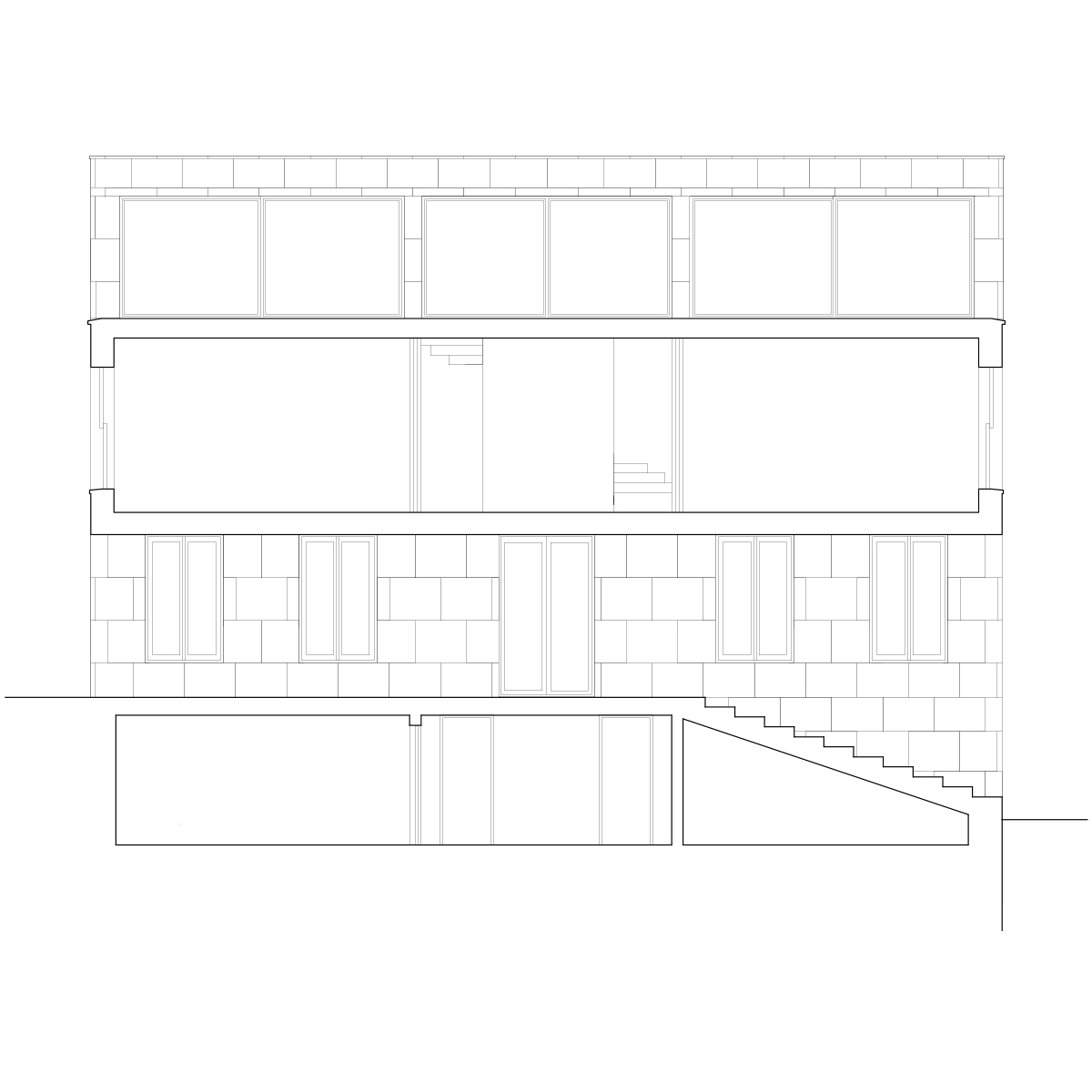 A special feature of the design is the two-part longitudinal division of the residential building. On the ground floor, this creates a private path to the canal at the back, halfway up which is the entrance to the house; on the second floor, a narrow roof terrace extends over the entire depth of the plot. This intervention leads to an unconventional tripartition of the house, both in plan and section. It appeals to the iconography of the letter H, but at the same time emphasises the representativeness of the facade. The stately appearance towards the street is repeated at the back of the house. The materialisation in stacked Belgian bluestone, has a stately appearance and refers to the familiar elements of buildings on Amsterdam’s Herengracht.