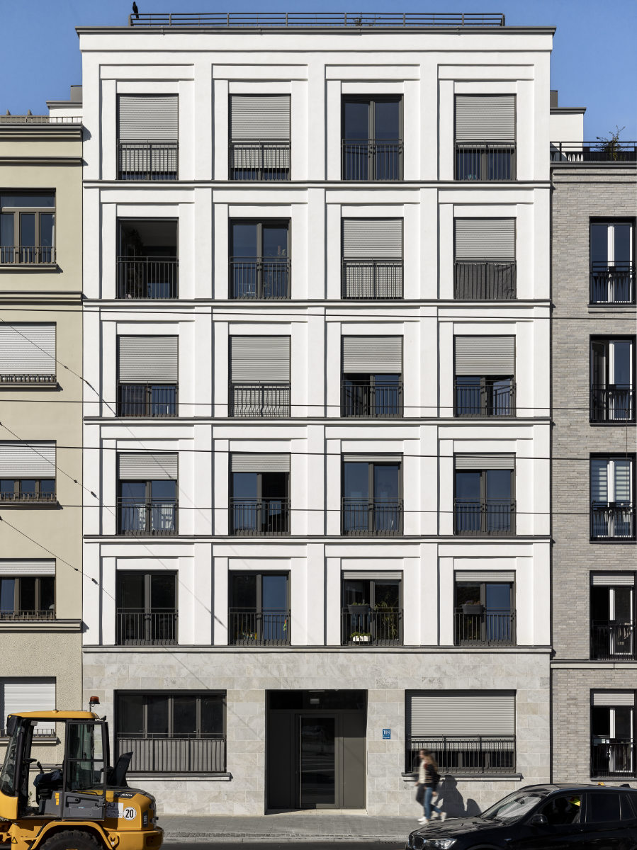 The design guideline, based on the principle of the ‘city as a community of houses’, was translated into a diverse cityscape. The houses have different building and storey heights. A raised ground floor mediates between the street/park side and the inner courtyard. The outer facades have a classical tripartide division. Together, the houses form a family of houses, in which each individual house has its own materiality, its own character. The plinth distinguishes itself from the upper floors by its materiality or colour. The entrances are arranged centrally and highlighted by their design. The houses are mutually fine-tuned in natural and light sandstone colours.